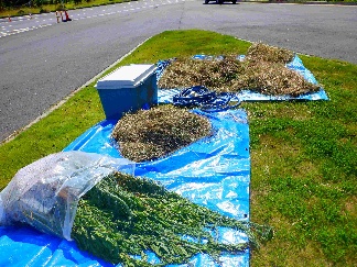 1日の天日干しで刈草の重量は39%減、70リットルの袋5袋から4袋、セイタカアワダチソウの重量は33%の減となりました。