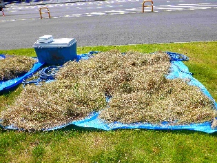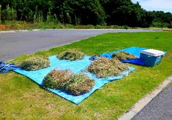 ごみの減量手段のひとつとして、組合所管のごみ処理施設内で刈った草を使用して天日干しにより、どの程度軽くなるか実験してみました。