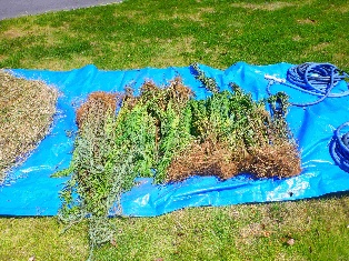 2日間の天日干しで刈草の重量は53%減、70リットルの袋5袋から3袋、セイタカアワダチソウの重量は63%の減となりました。